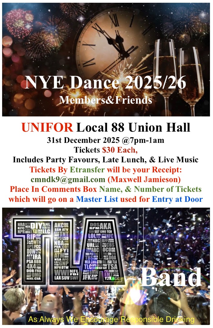 Please be advised that this is NOT a Unifor Local 88 sponsored event, but a private rental for New Years Eve, being held at the union hall.  Payments will not be accepted by Unifor Local 88.  Please see the poster for details.