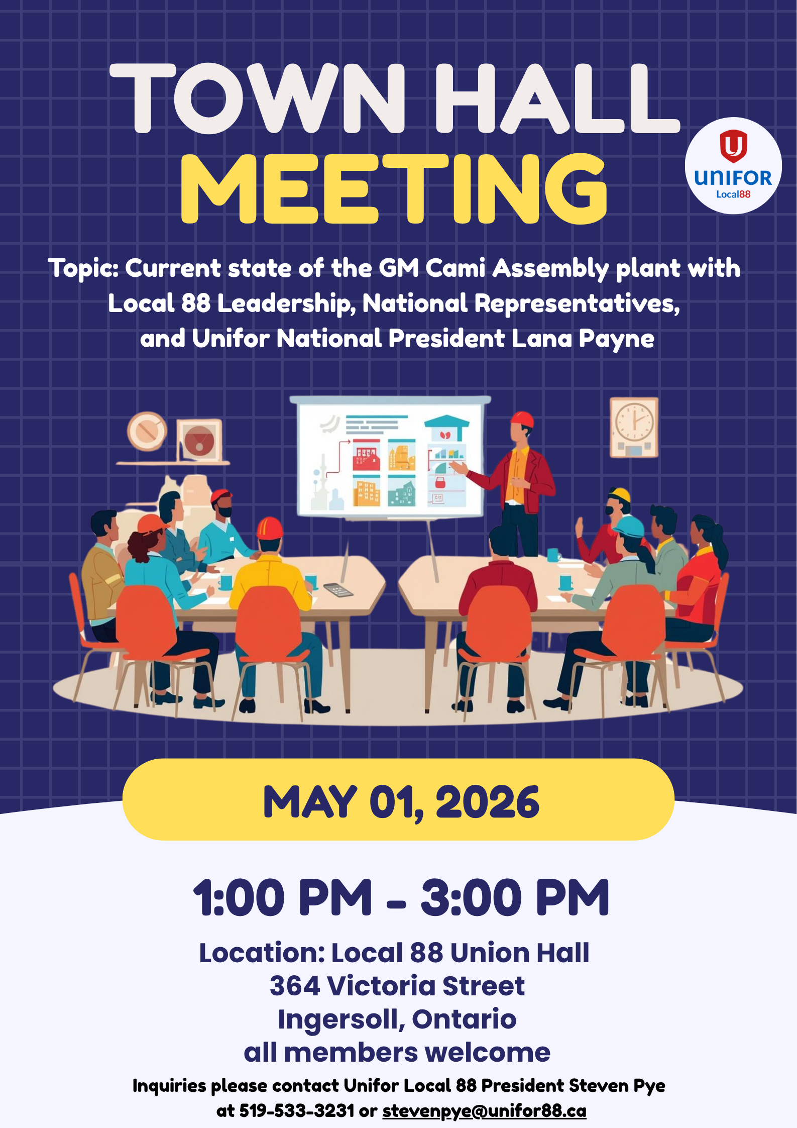 Join us on May 1 from 1:00–3:00 PM at the Local 88 Union Hall in Ingersoll for a Town Hall Meeting on the current state of the GM CAMI Assembly Plant.